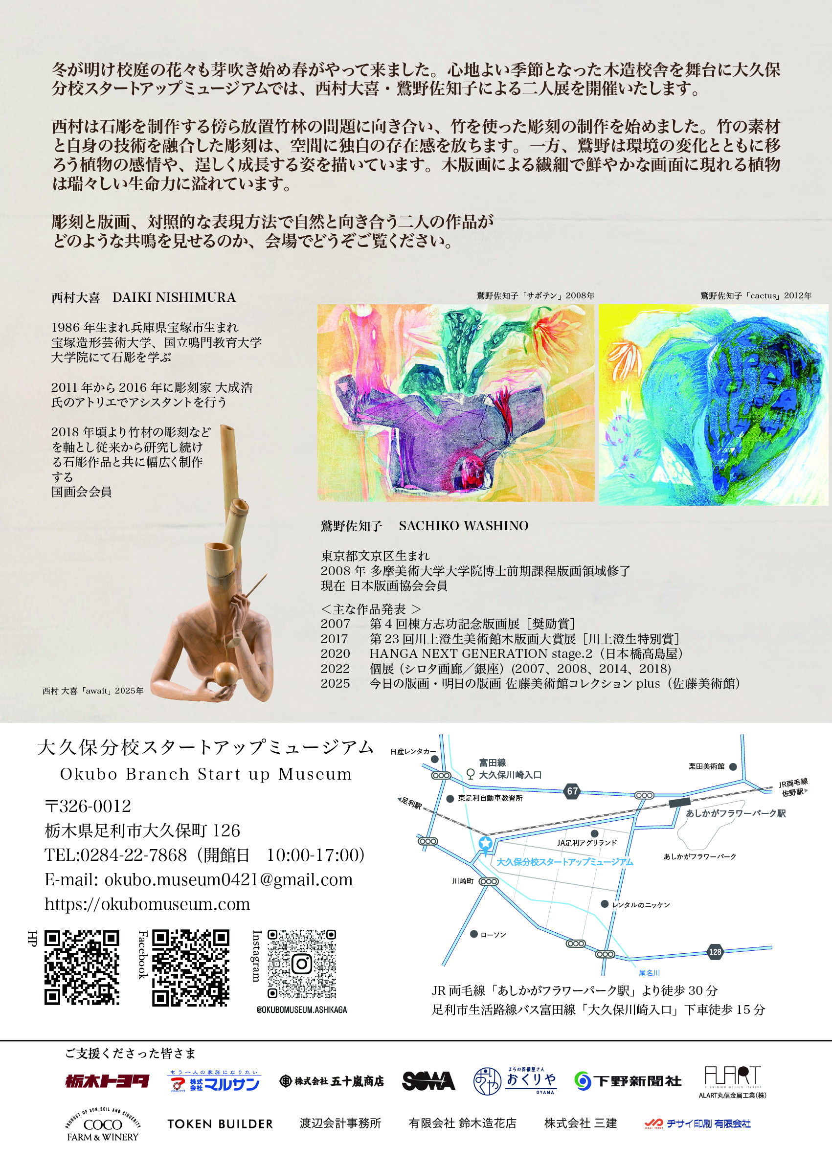 冬が明け校庭の花々も芽吹き始め春がやって来ました。心地よい季節となった木造 校舎を舞台に、大久保分校スタートアップミュージアムでは、西村大喜・鷲野佐知 子による二人展を開催いたします。