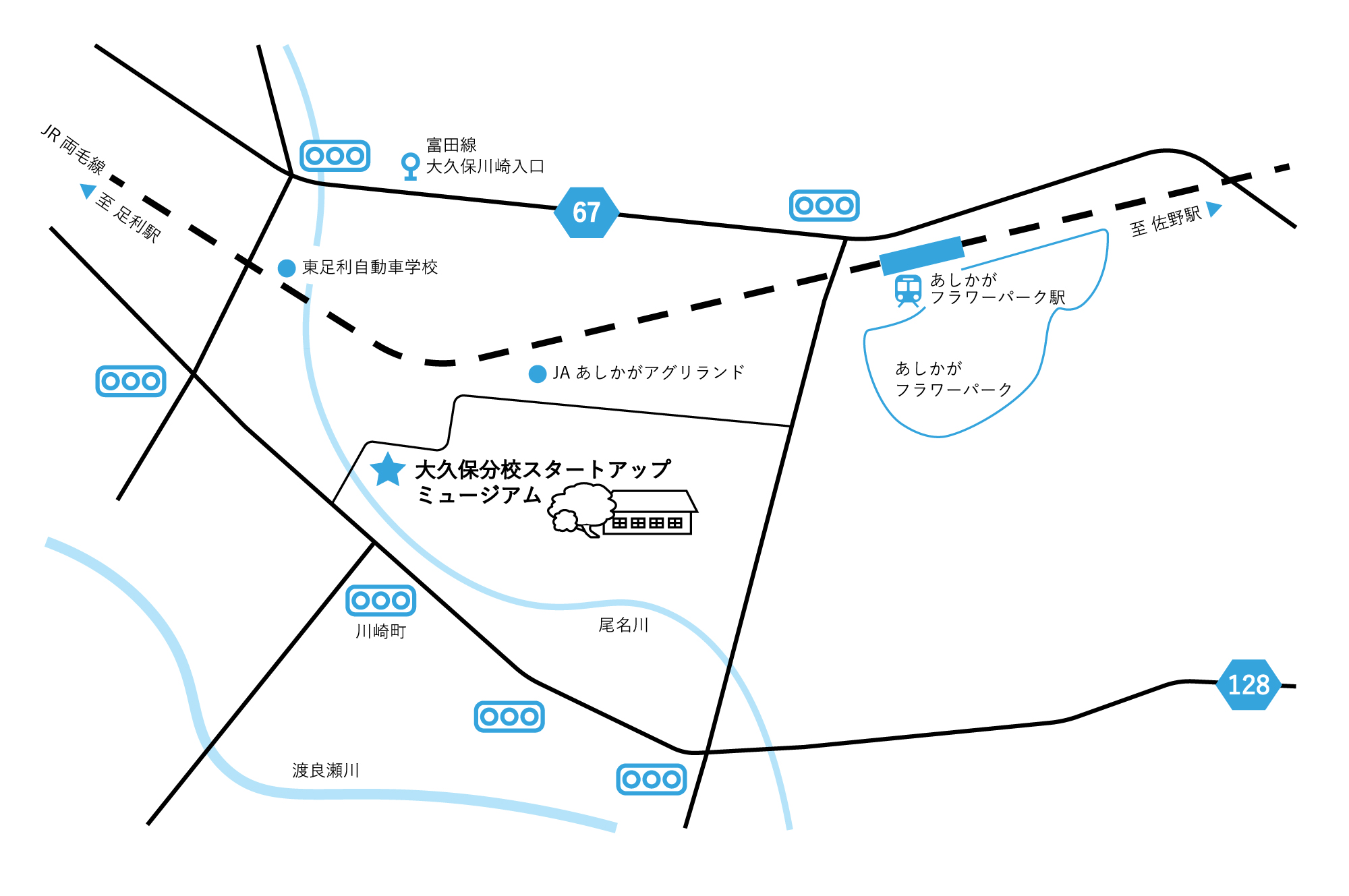 JR両毛線「あしかがフラワーパーク駅」より車で5分以内、または徒歩30分