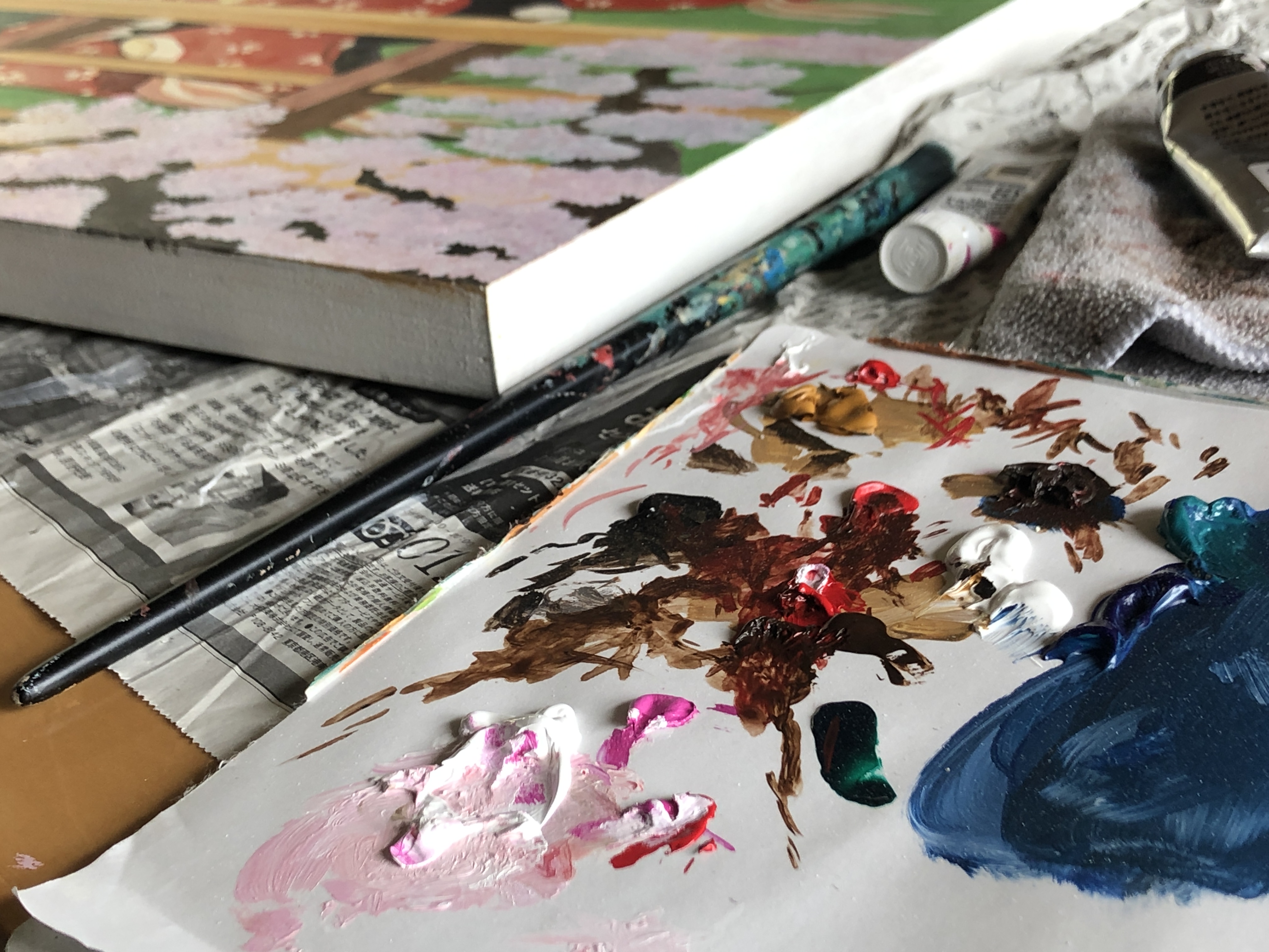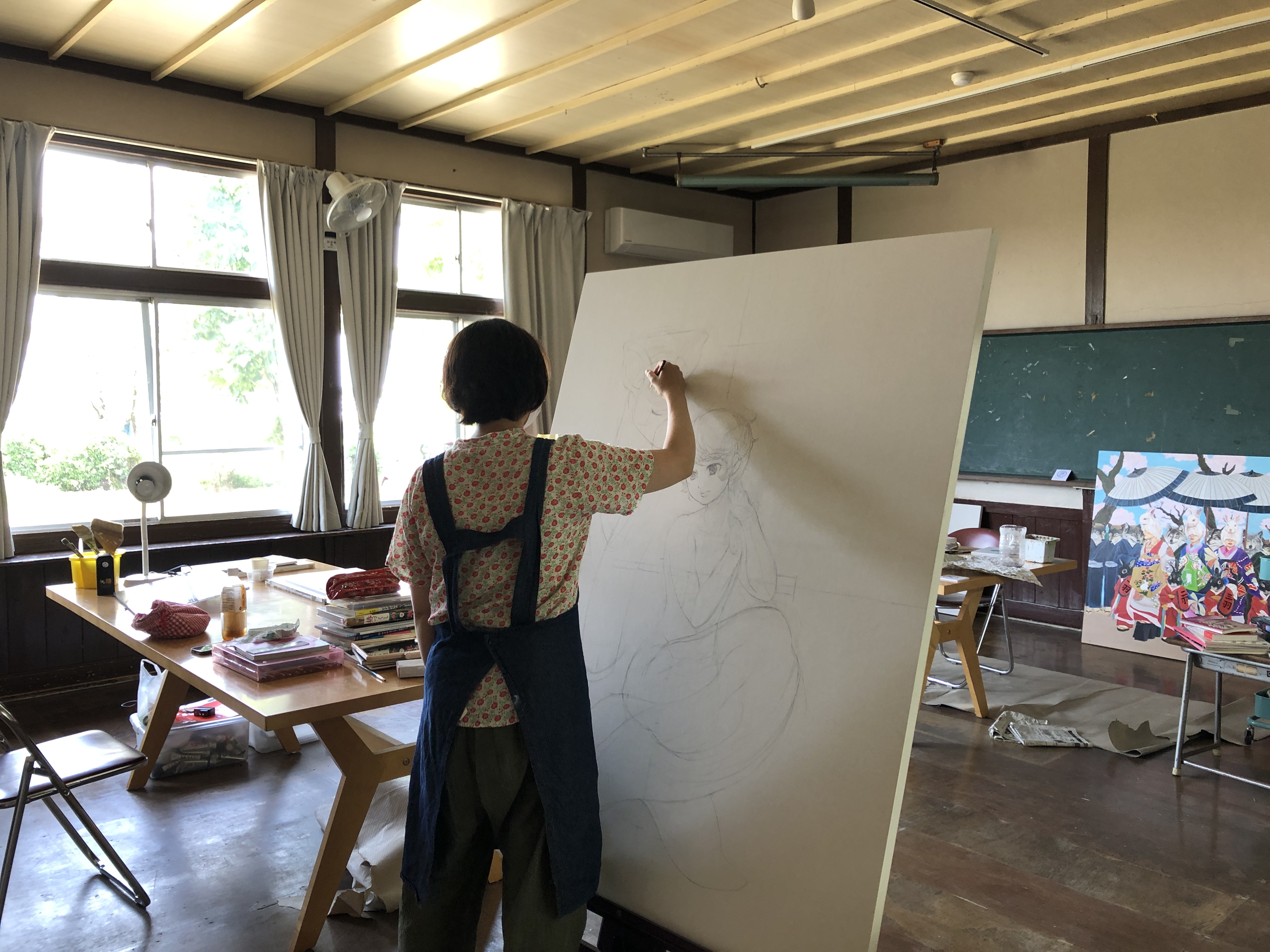 今回は展示室を制作スペースに設え、ペインティングをメインに、期間中作家が制作を行います。完成したものを見る機会はあっても、作家が何を考え、手を動かし、作品をつくり上げるのか、その過程を実際に目にする機会は滅多にないかもしれません。日々作品がかたちになっていく様子を楽しんでいただけましたら幸いです。