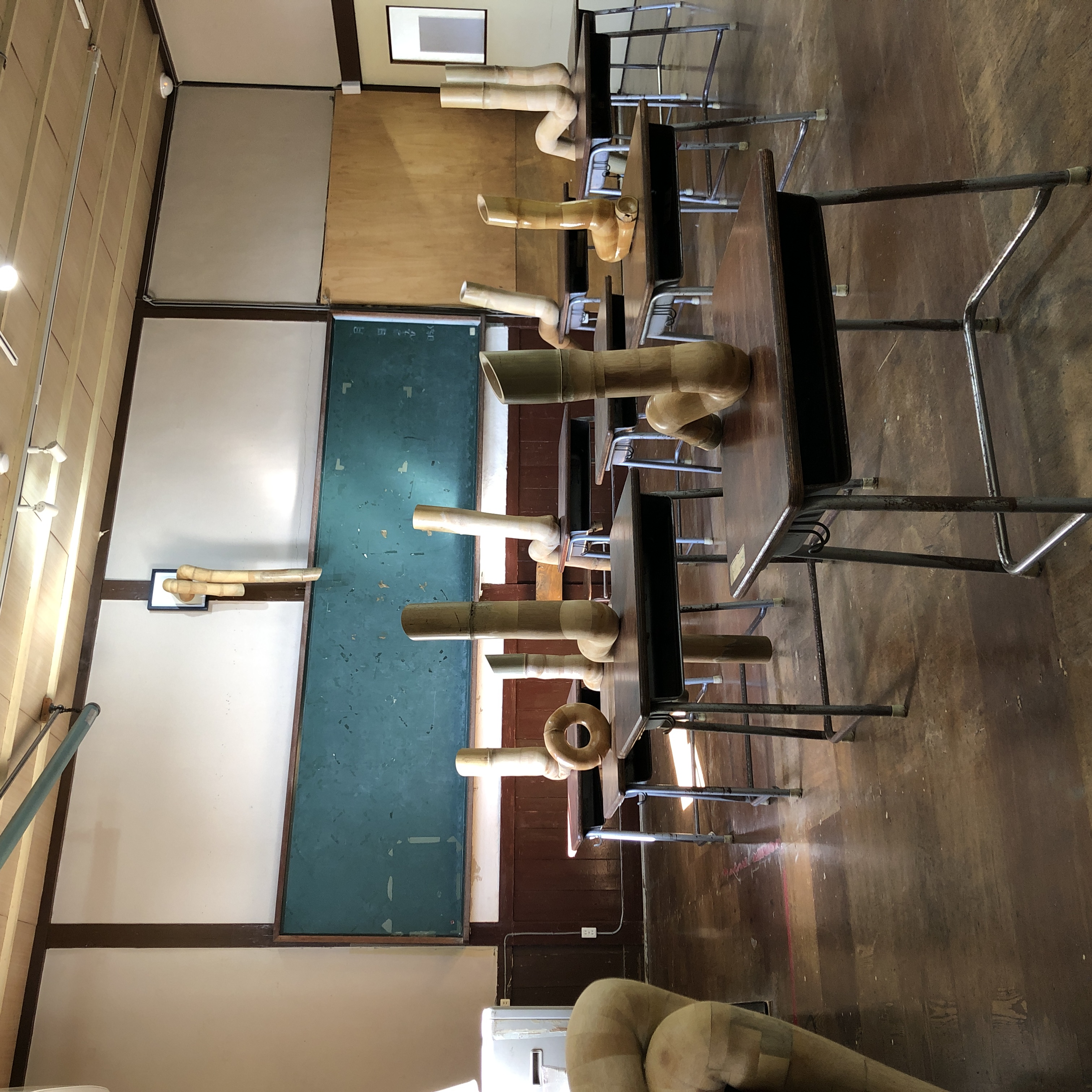 今回の展示では、従来の抽象の彫刻作品とともに、より具象的な、ひとのようなかたちの、あえて学習机を台座に使った作品が並び、展示室の空間そのものが作品となるインスタレーションが制作されます。寄り添って並んだり、隠れたり、すっと背筋を伸ばして“座る”ひとたち。いろいろな想像を膨らませお楽しみください。