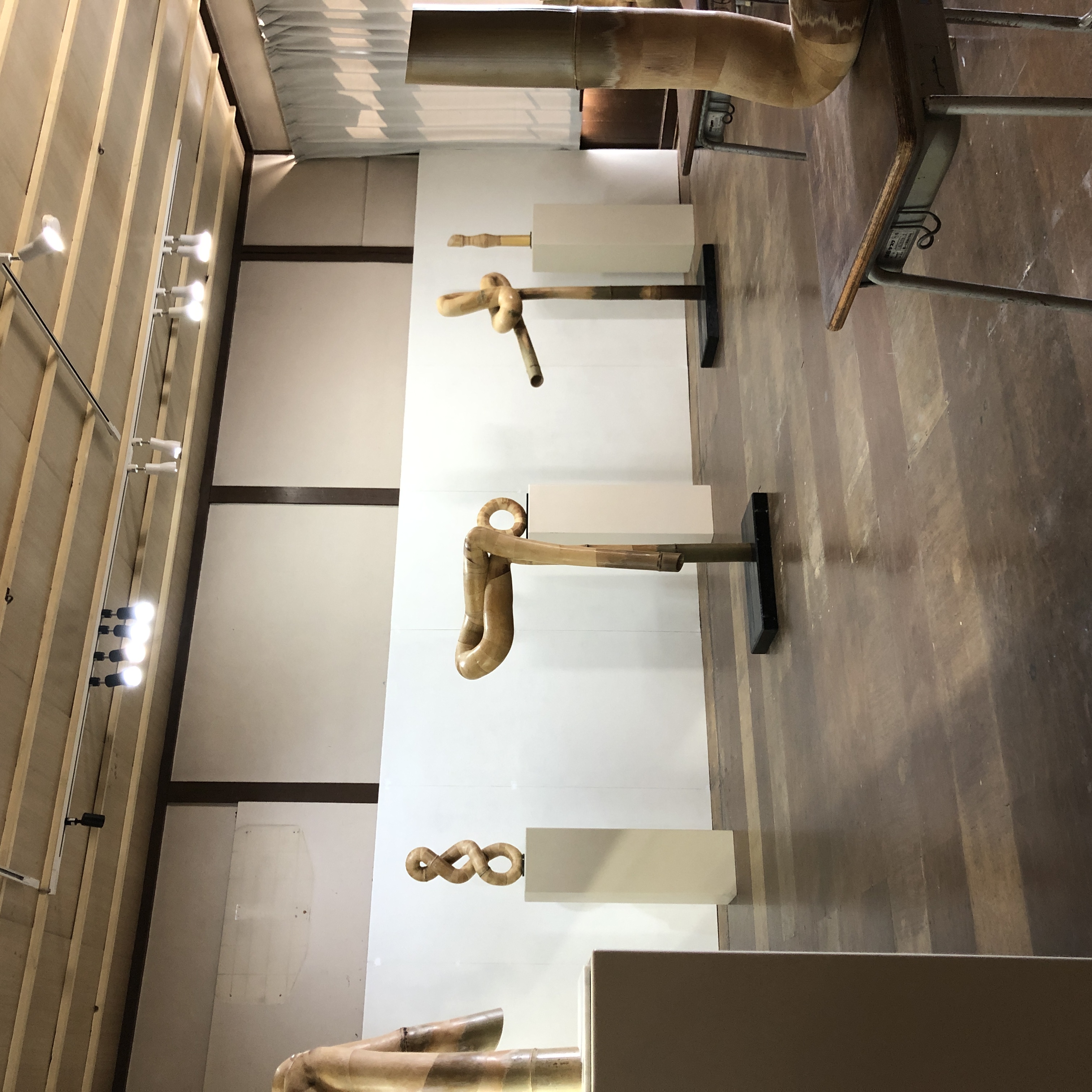 石彫から出発した西村は、放竹林や使い捨て素材の使用についての疑問など環境問題への関心からつながり、2018年頃より竹を使った作品の制作を始めます。