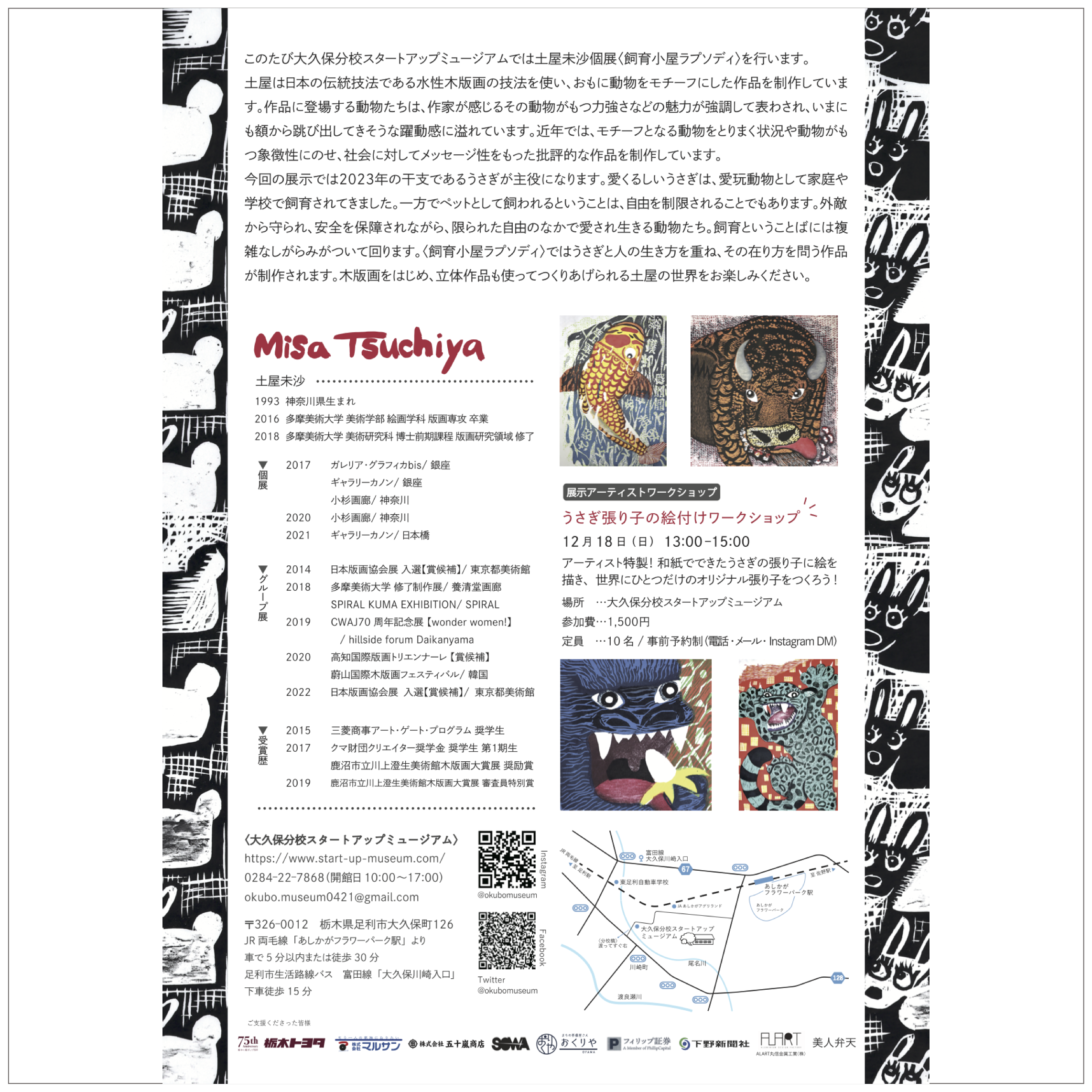 今回の展示では2023年の干支であるうさぎが主役になります。愛くるしいうさぎは、愛玩動物として家庭や学校で飼育されてきました。一方でペットとして飼われるということは、自由を制限されることでもあります。外敵から守られ、安全を保障されながら、限られた自由のなかで愛され生きる動物たち。飼育ということばには複雑なしがらみがついて回ります。〈飼育小屋ラプソディ〉ではうさぎと人の生き方を重ね、その在り方を問う作品が制作されます。木版画をはじめ、立体作品も使ってつくりあげられる土屋の世界をお楽しみください。