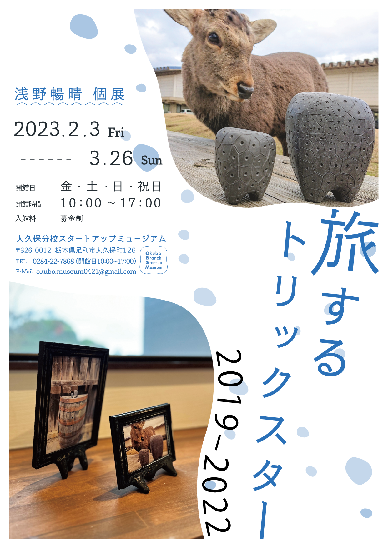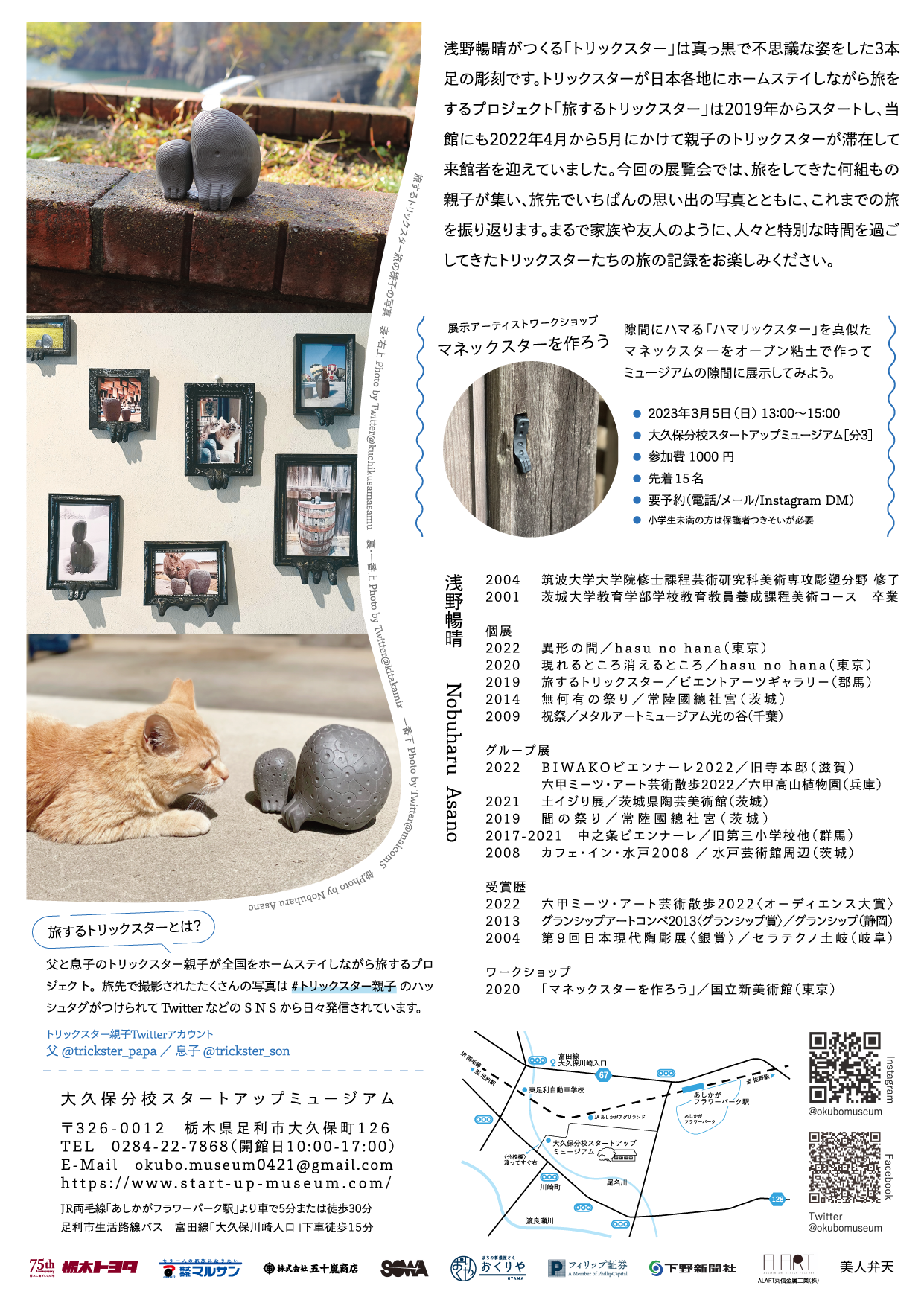 大久保分校スタートアップミュージアム第 5回目の展示は、浅野暢晴の個展「旅するトリックスター2019-2022」を行います。浅野暢晴がつくる「トリックスター」は真っ黒で不思議な姿をした3本足の彫刻です。トリックスターが日本各地にホームステイしながら旅をするプロジェクト「旅するトリックスター」は2019年からスタートし、当館にも2022年4月から5月にかけて親子のトリックスターが滞在して来館者を迎えていました。