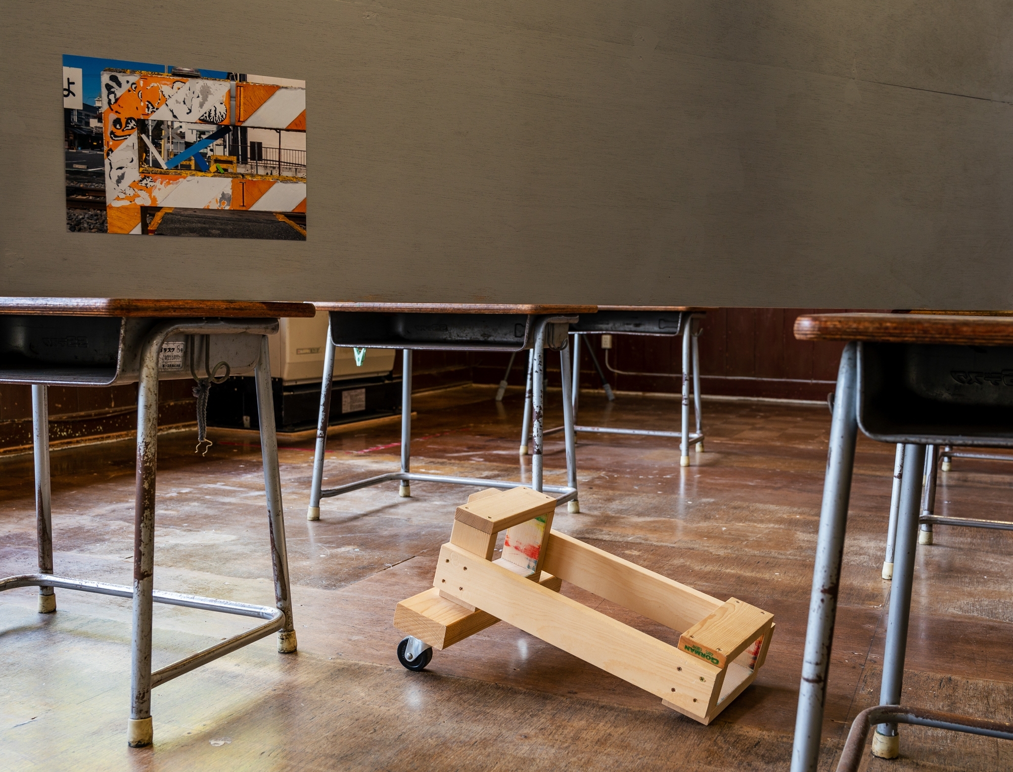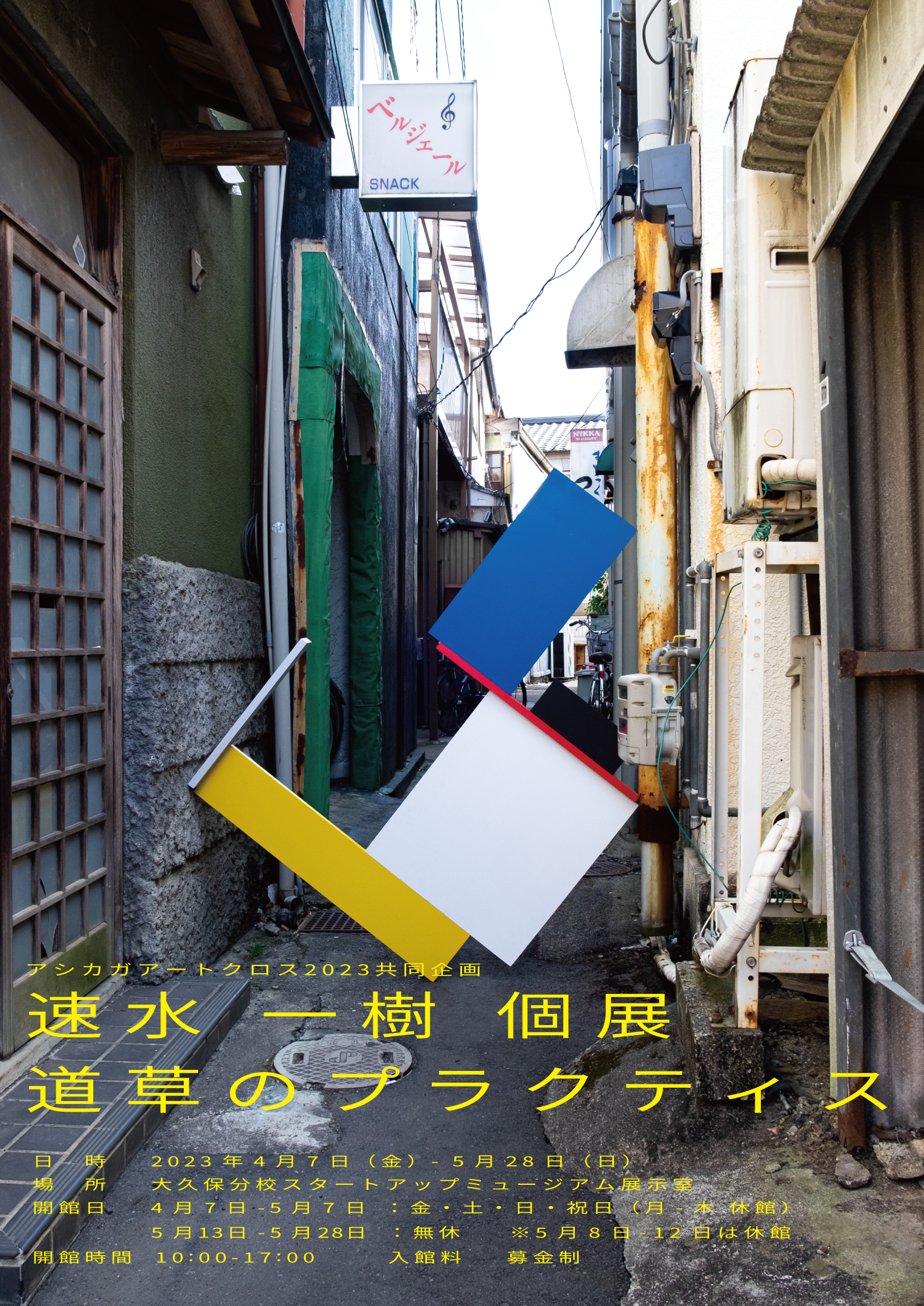 大久保分校スタートアップミュージアム7回目の展示は、速水一樹「道草のプラクティス」を行います。速水は近年鮮やかな色の板や角材を路地などで即興的に組み立てるなど「遊び」の要素を持った独自の手法で都市空間へ介入し、その場に応じて偶然現れるかたちの面白さを探るパフォーマンス作品を制作しています。