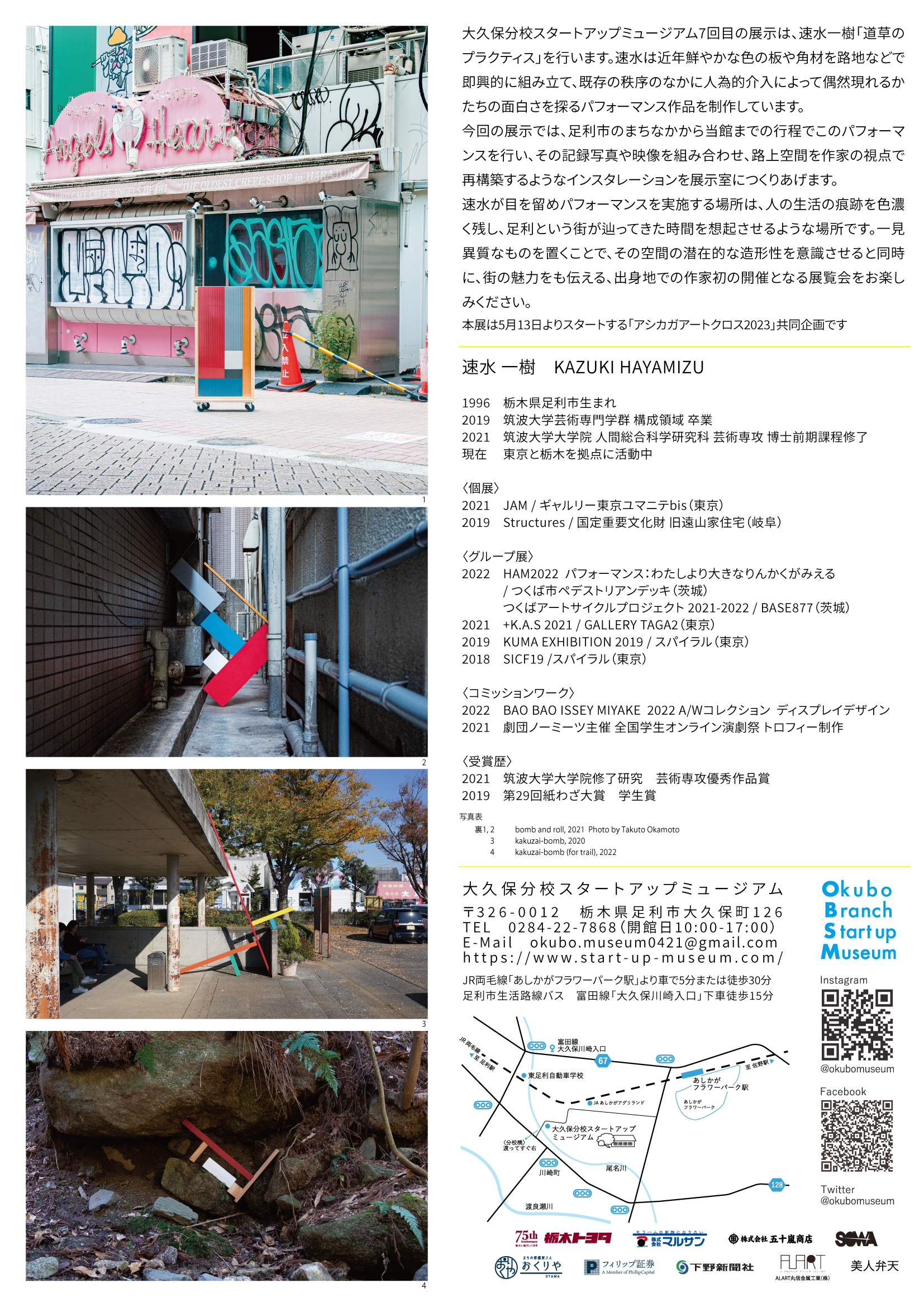 速水が目を留めパフォーマンスを実施する場所は、人の生活の痕跡を色濃く残し、足利という街が辿ってきた時間を想起させるような場所です。一見異質なものを置くことで、その空間の潜在的な秩序や造形性を意識させると同時に、街の魅力をも伝える、出身地での作家初の開催となる展覧会をお楽しみください。