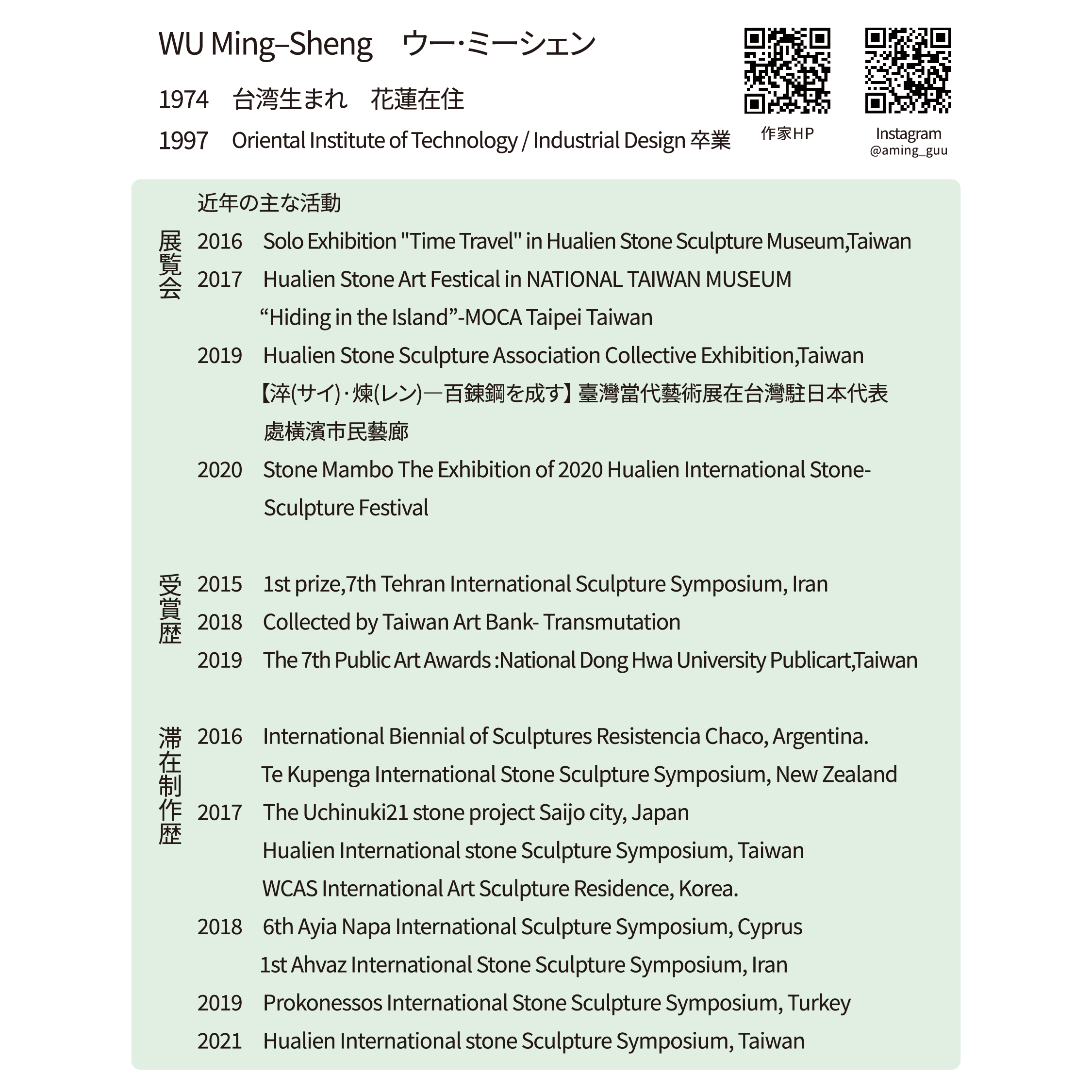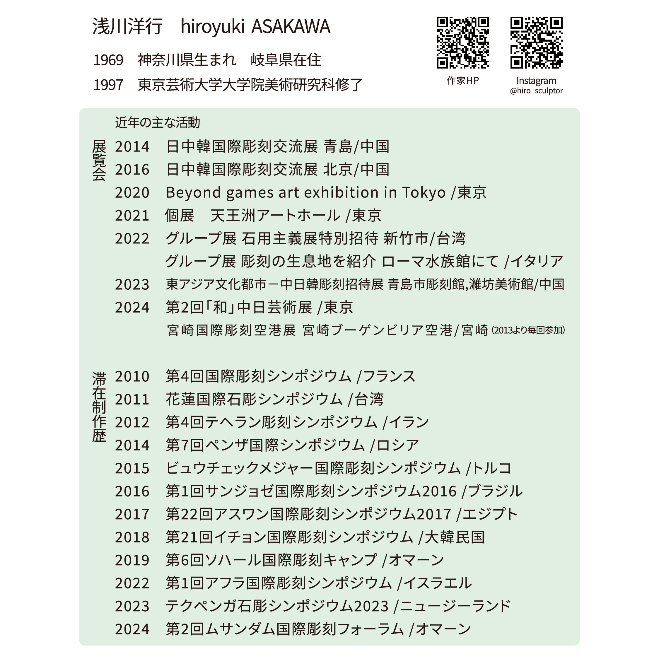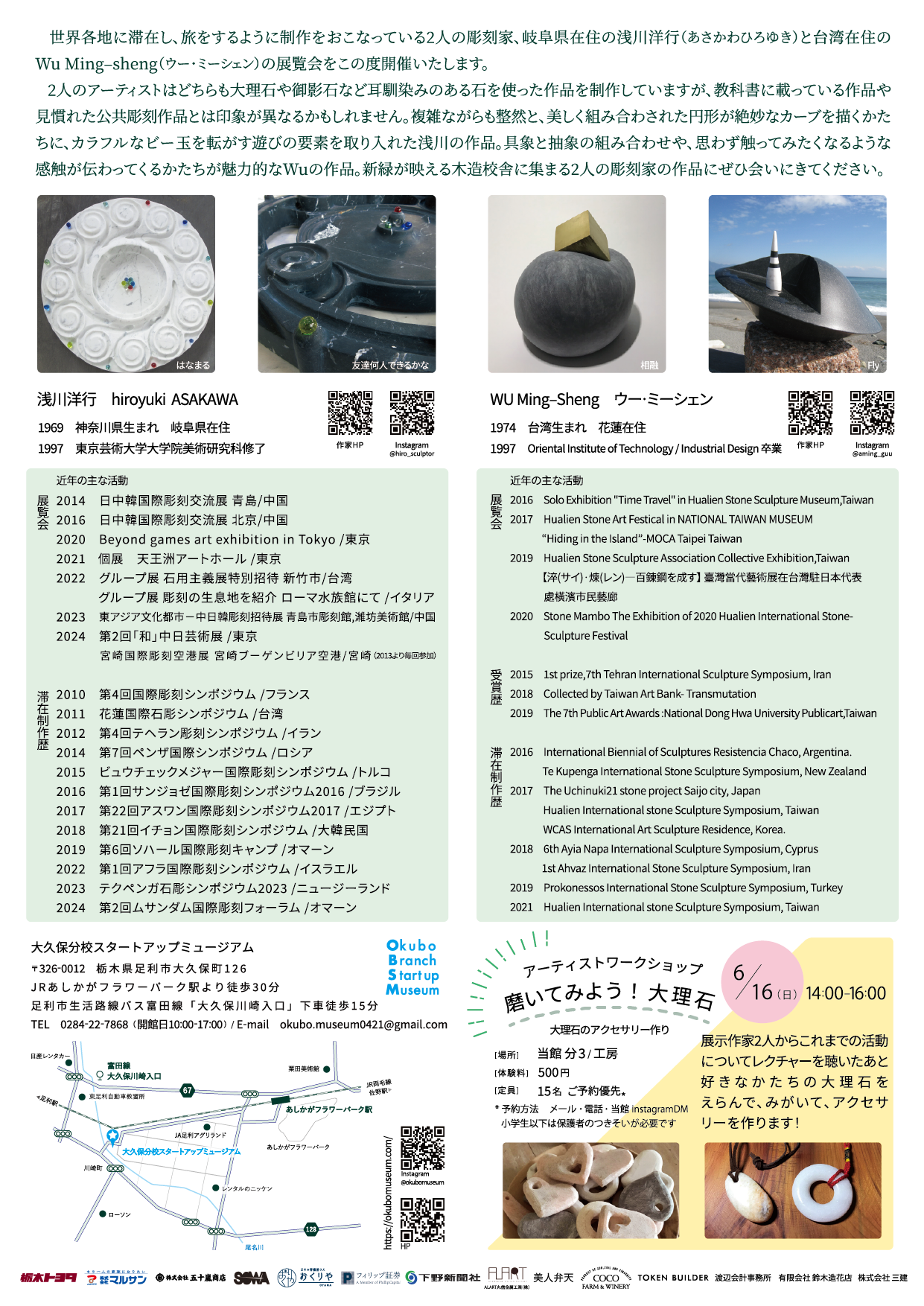世界各地に滞在し、旅をするように制作をおこなっている2人の彫刻家、岐阜県在住の浅川洋行(あさかわひろゆき)と台湾在住のWu Ming-sheng(ウー・ミーシェン)の展覧会をこの度開催いたします。