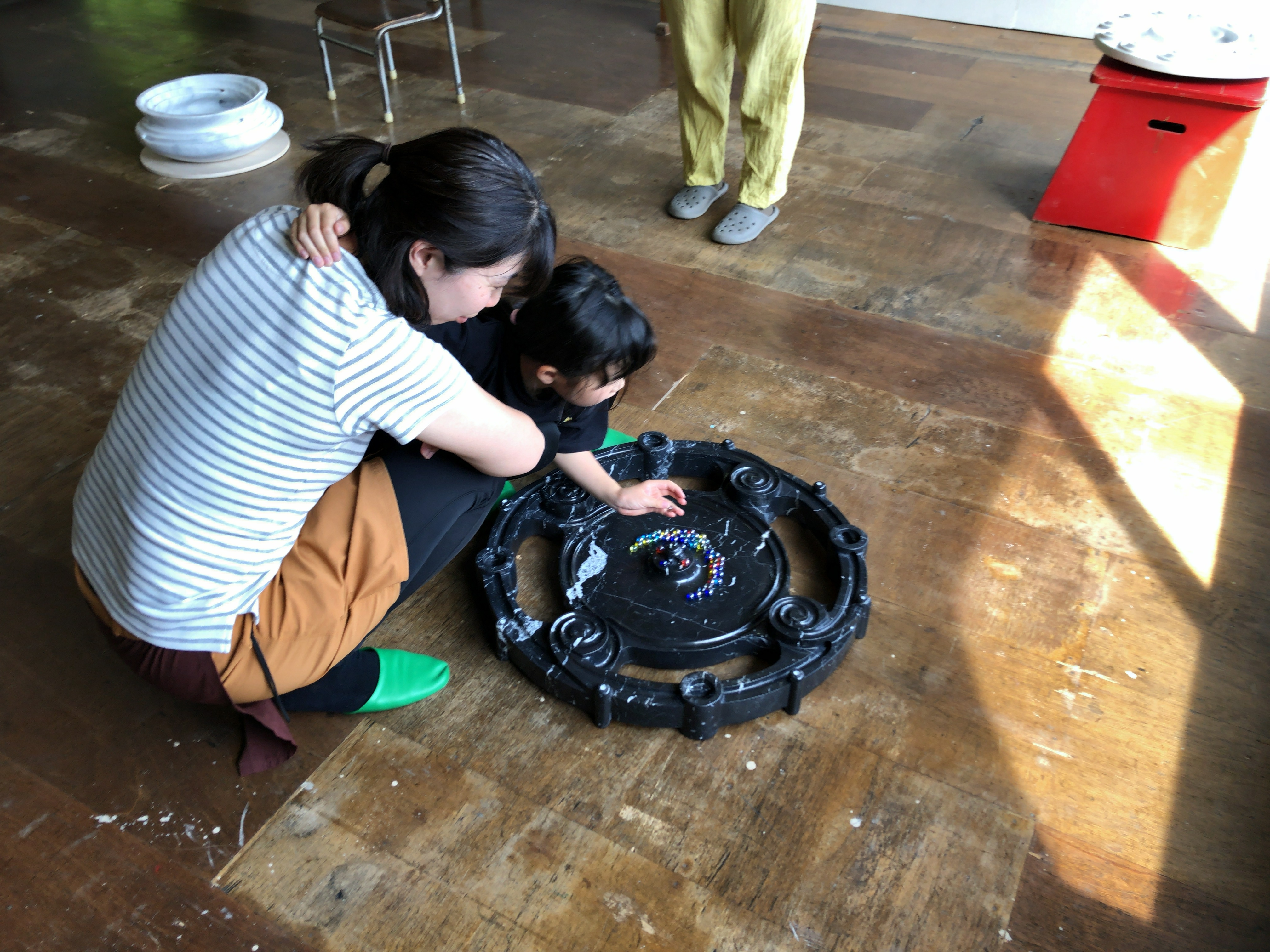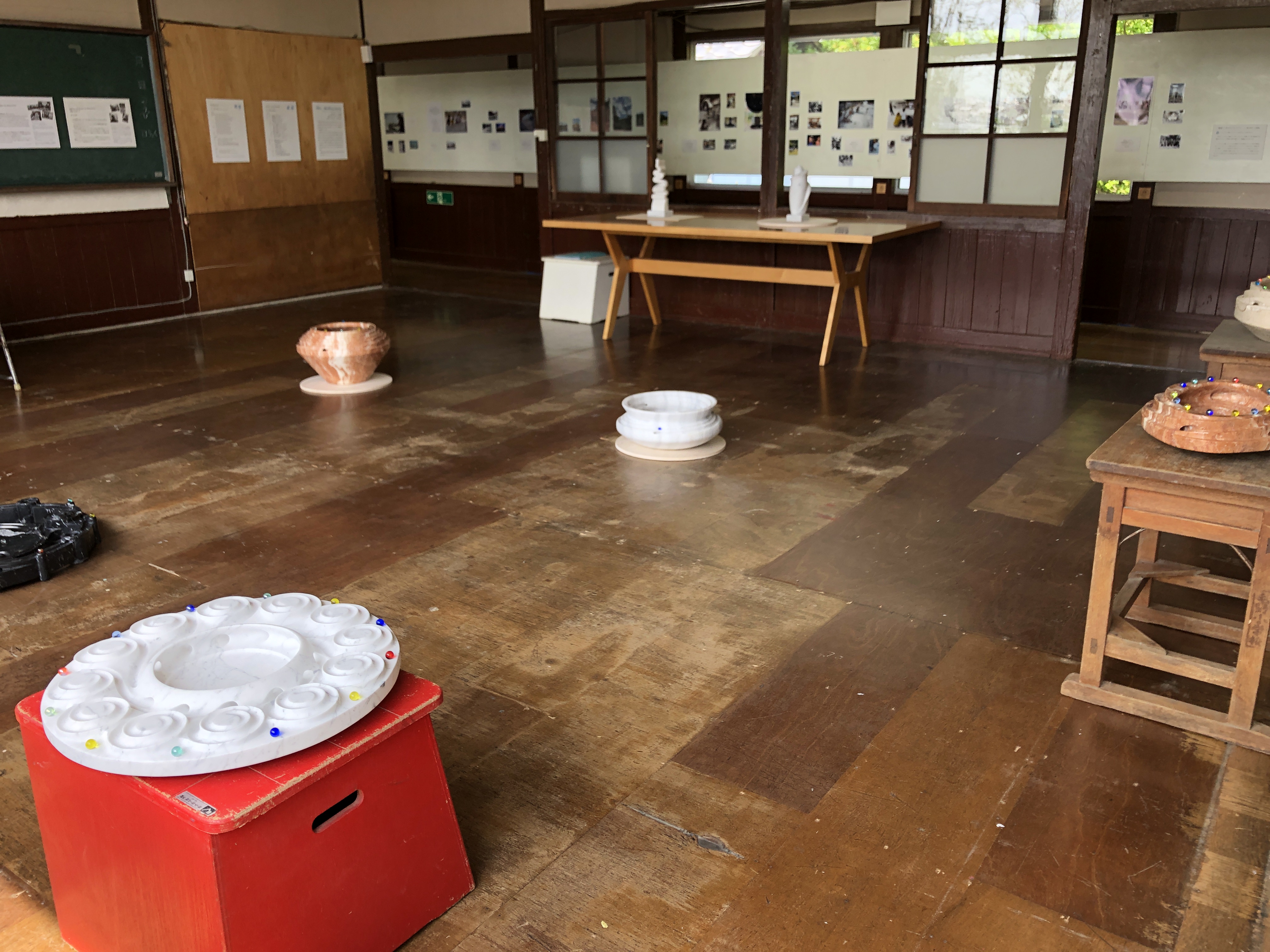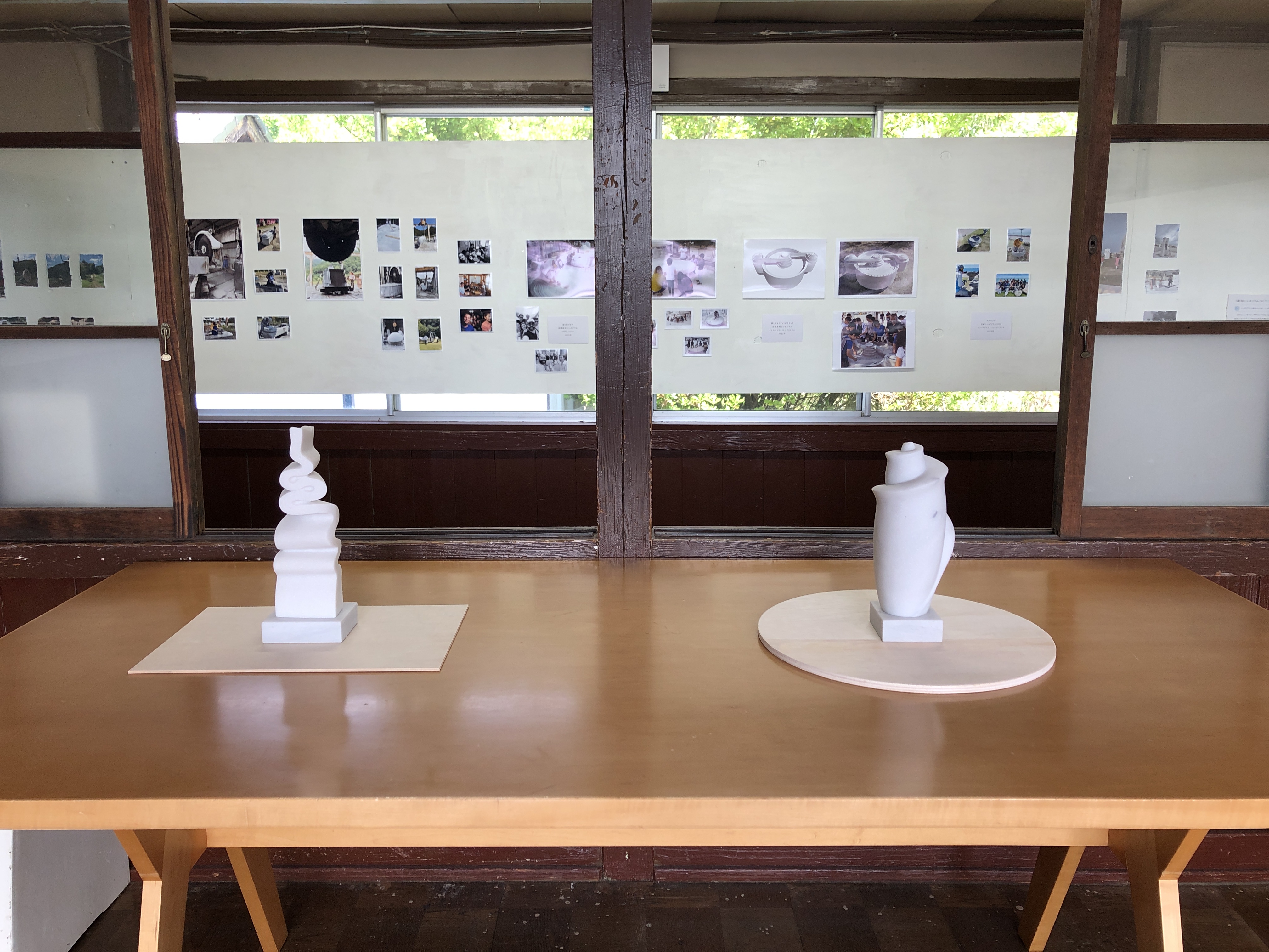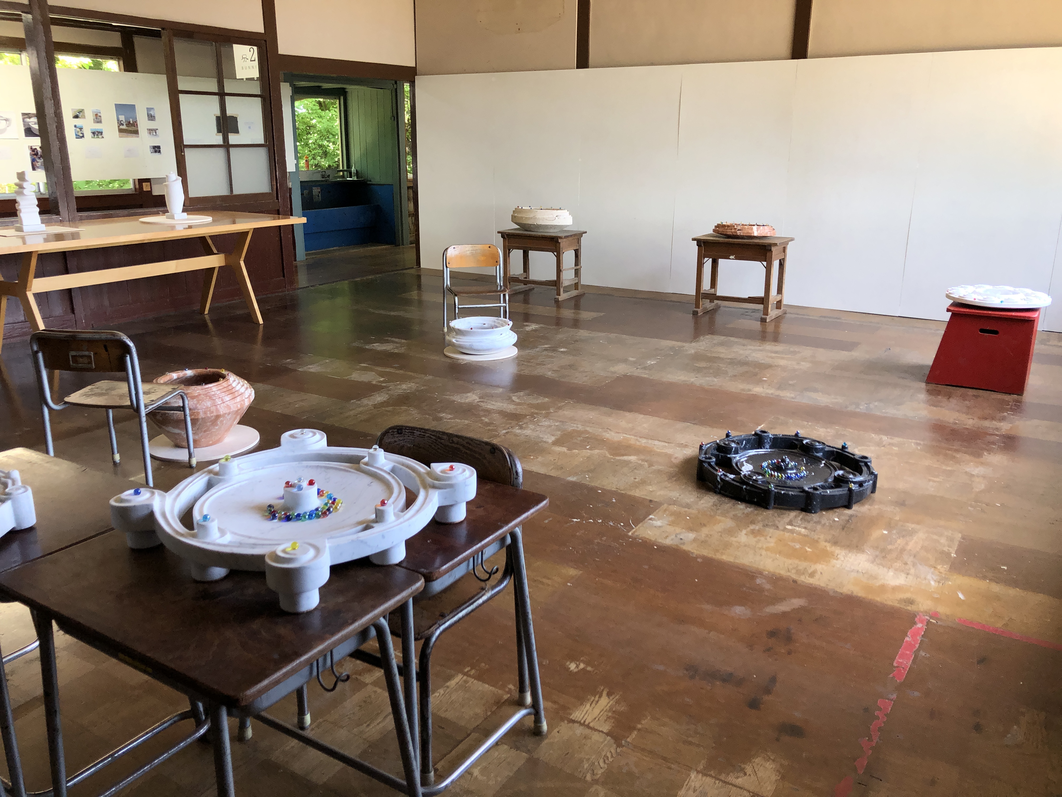 複雑ながらも整然と、美しく組み合わされた円形が絶妙なカーブを描くかたちに、カラフルなビー玉を転がす遊びの要素を取り入れた浅川の作品。具象と抽象の組み合わせや、思わず触ってみたくなるような感触が伝わってくるかたちが魅力的なWuの作品。新緑が映える木造校舎に集まる2人の彫刻家の作品にぜひ会いにきてください。